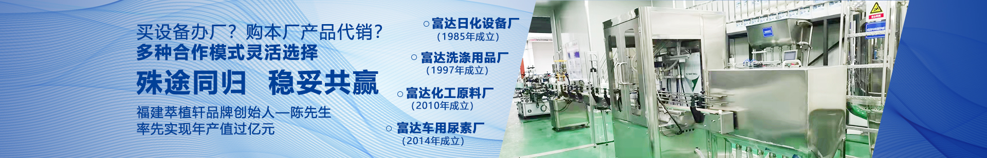 我廠主要生產洗潔精洗衣液等洗滌產品設備,洗發水沐浴露洗手液等化妝品設備,肥皂香皂生產設備,洗衣粉生產設備等40多種類型的相關設備,同時生產銷售相關化工原料及日化產品,并提供相關產品技術支持,公司有富達、生態凈瀑、潔莉寶貝、綠草凈,小流彈等日化行業相關的105個注冊商標,30多年一直走來,實屬不易,無論是設備還是日化產品技術,都經過了更新換代,積淀了一些經驗,也許對您有所幫助。